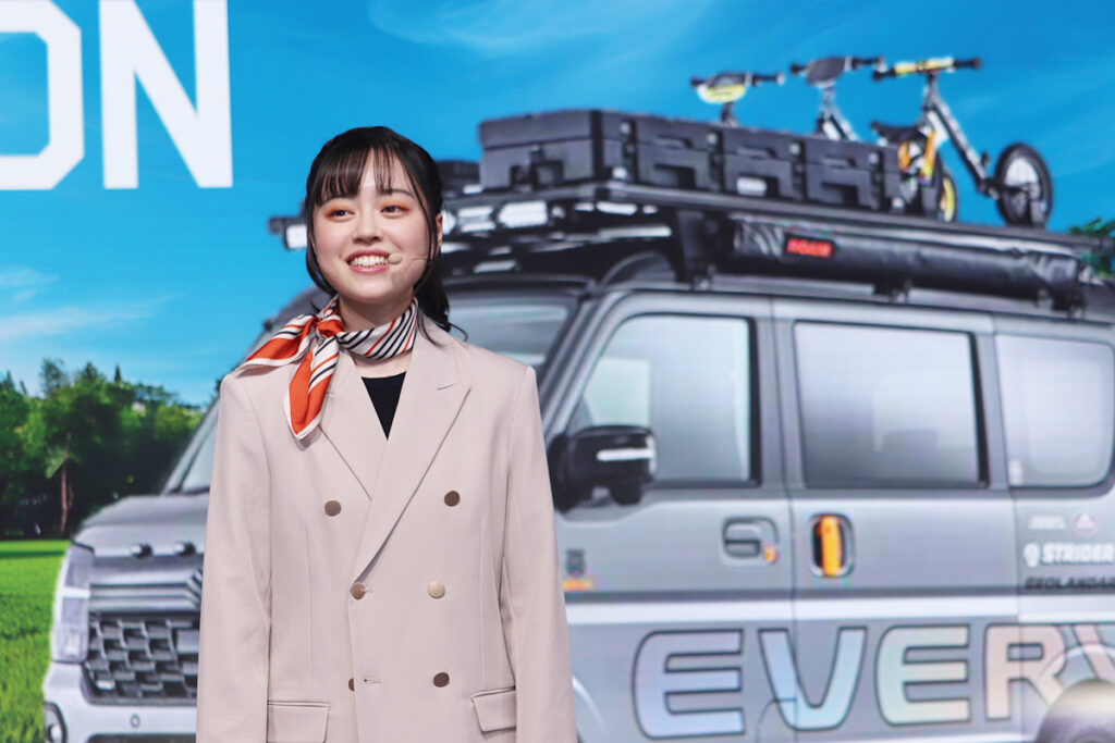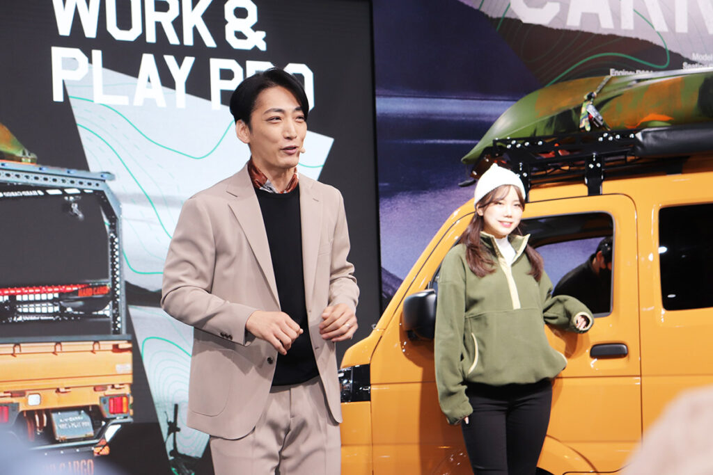 MCが軽快なトークで会場を盛り上げる中、モデルが実際に車に乗り込み、リアルな使用シーンや細かな機能を一つひとつ丁寧に紹介。